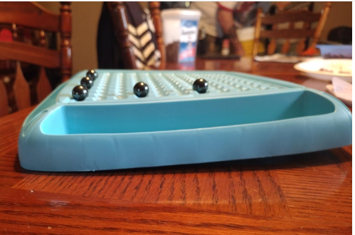 Players move the marbles without dropping them, following the instructions from the challenge wheel.